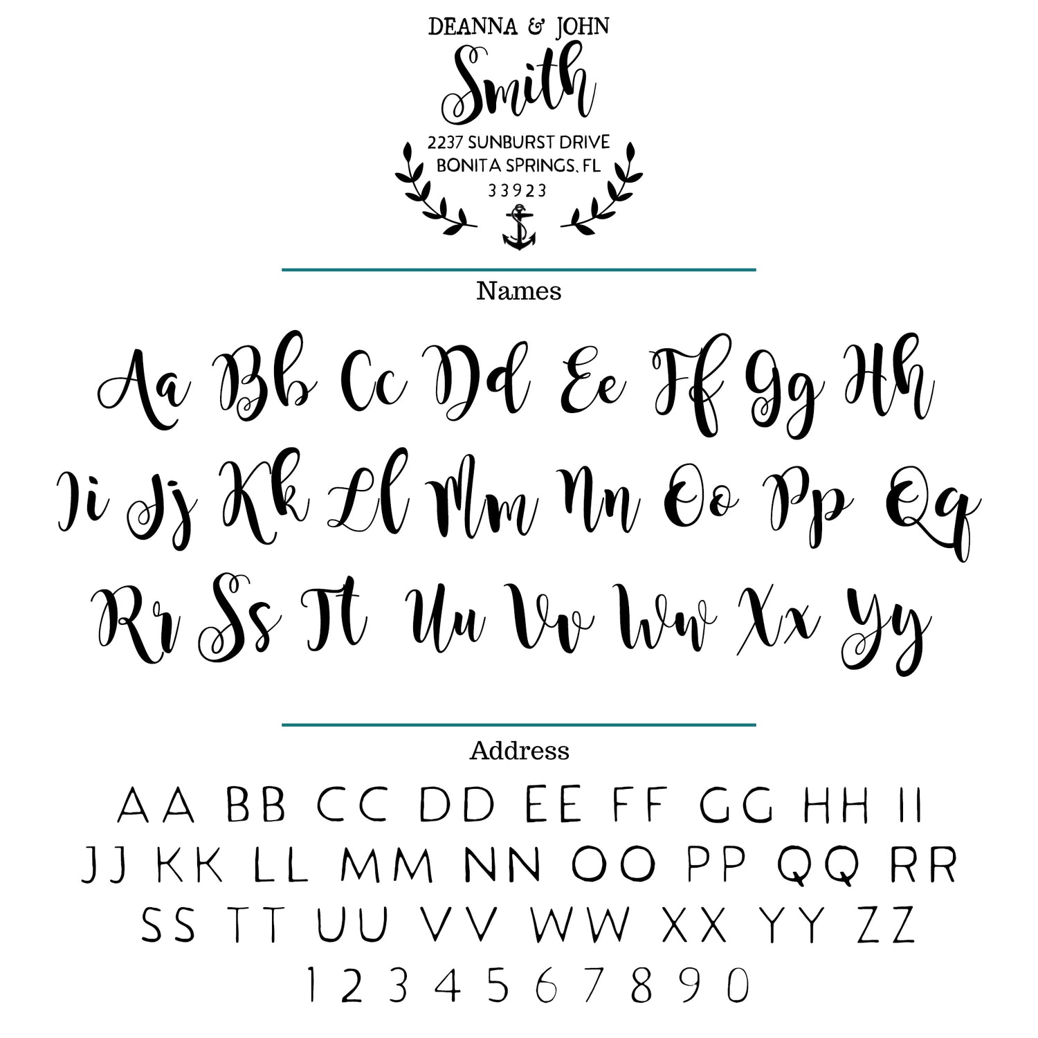 This address stamp features customizable text with bold cursive and modern font style and a fun eye catching anchor design element. Your stamp will be professionally laser engraved from real rubber and finished with a mount option of your choice.